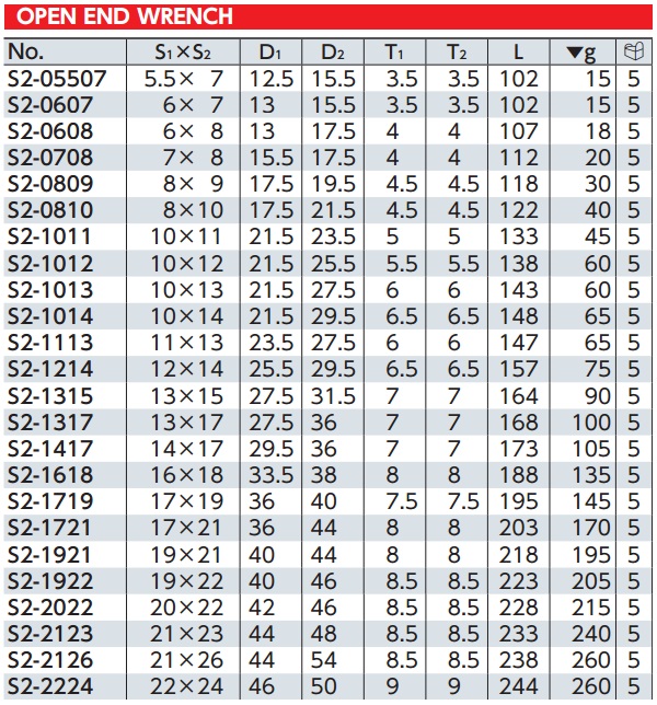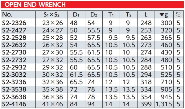 Bảng thông số dòng cờ lê mở KTC Nhật dòng S2: