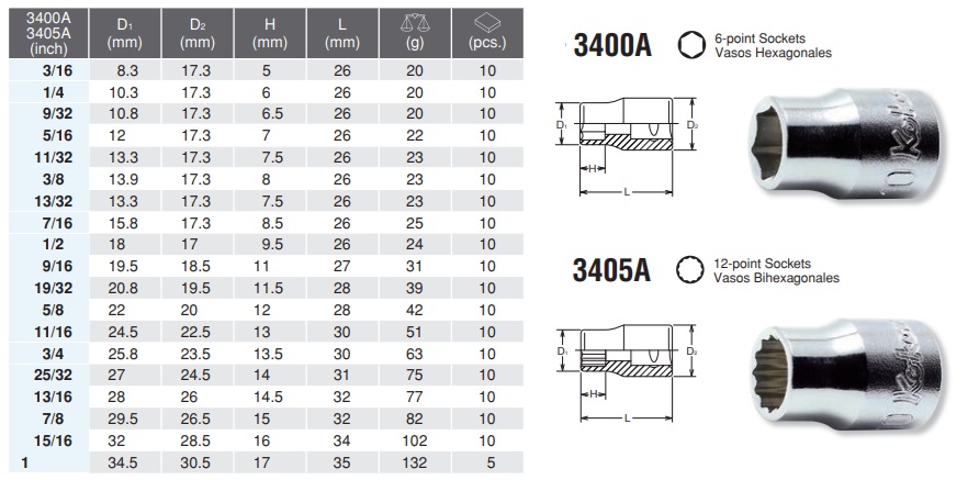 Thông số, hình ảnh đầu khẩu vặn ốc Koken dòng 3400A và 3405A: