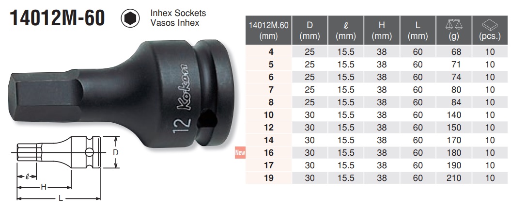 Với đầu khẩu 1/2 inch, tham khảo thông số bộ và cỡ lẻ mã RS14012M/10-L60: