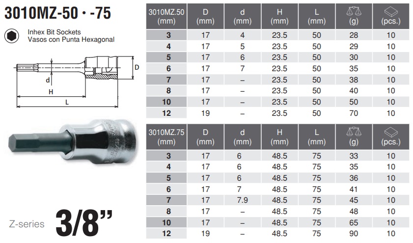 Mã số: RS3010M/8-L62 với các đầu lục giác từ 3 đến 12mm