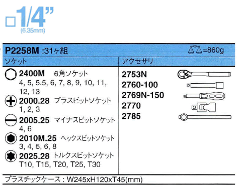 Thông số chi tiết sản phẩm bộ đầu khẩu 1/4 inch Koken P2258M: