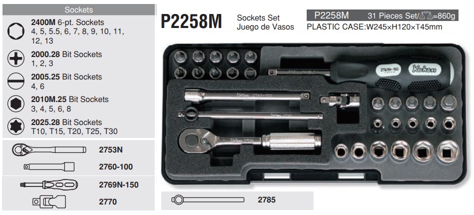 Bộ khẩu Koken 1/4 inch, Mã số: P2258M, với 31 chi tiết, gồm: |