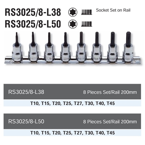 Bộ khẩu tuýp 3/8 hoa thị Loại có lỗ giữa Mã số: RS3025/9-HOLE Gồm 9 cỡ từ T10H-T50H Ký tự H thể hiện hoa thị có lỗ giữa dùng cho ốc có chốt an toàn ở giữa |