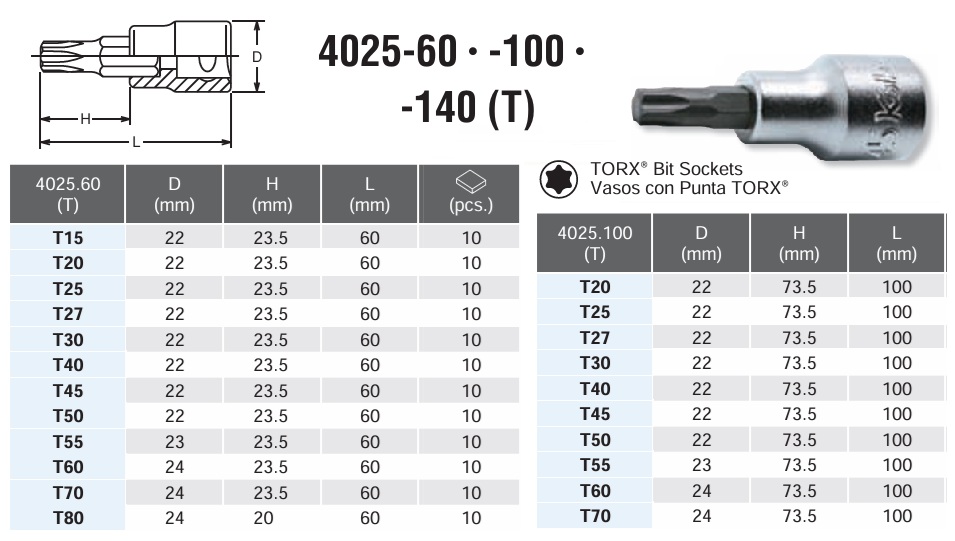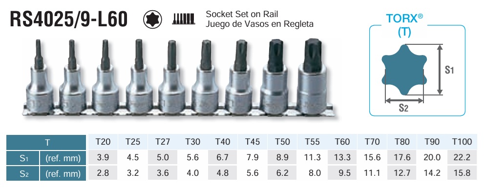 Chiều dài khẩu tuýp hoa thị: 60mm, với mũi hoa thị: từ T20 đến T60