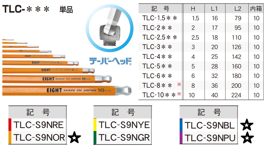 Bộ lục giác EIGHT hệ mét với màu thể hiện cho từng cỡ - TLC-S9N được sản xuất tại Nhật. |