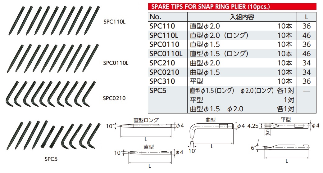 Mũi kìm phanh SPC110L (mũi thẳng dài 2mm) được dùng cho 2 mã kìm phanh: SCP-171 và SOP-171 |