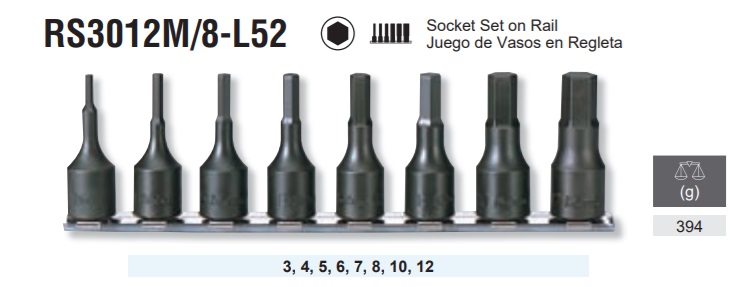 Bộ lục giác RS3012M/8-L52 gồm 8 cỡ từ 3-12mm, với đầu nối 3/8, đúc liền khối |