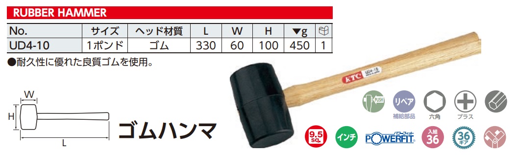 Búa cao su KTC Nhật, cán gỗ sồi, trọng lượng 450g, đường kính đầu búa: 60mm |