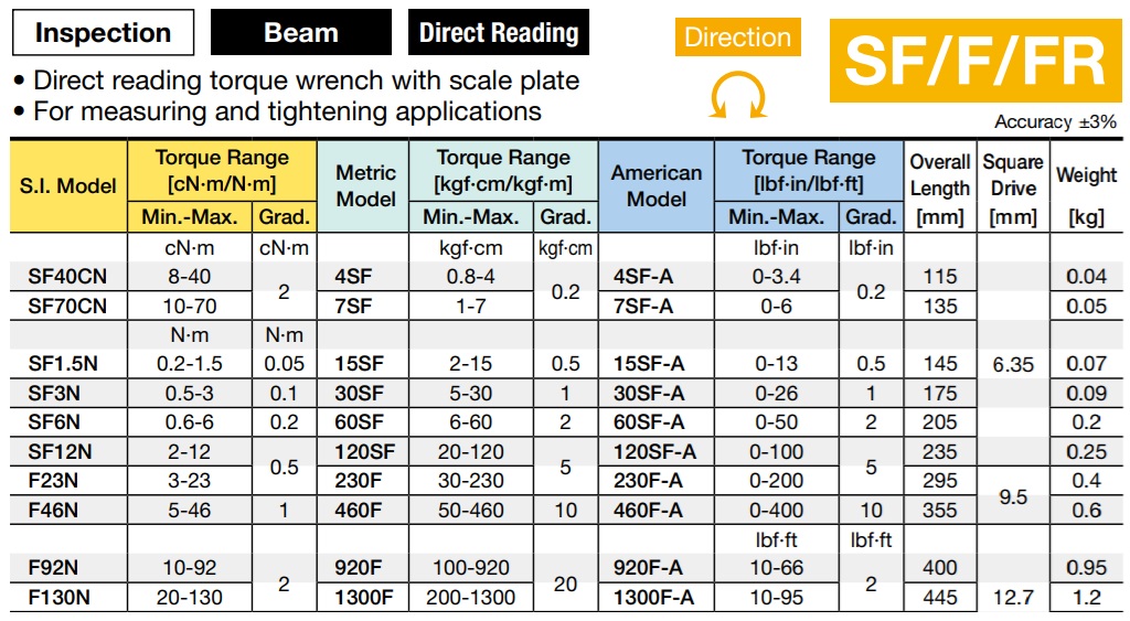 Thông số sản phẩm cờ lê xiết lực Tohnichi dòng SF-F-FR: