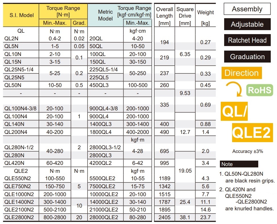Thông số các lựa chọn cờ lê lực điều chỉnh của Tohnichi dòng QL/QLE2: