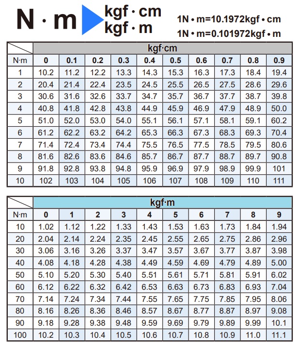 Bảng chuyển đổi đơn vị đo từ Nm sang kgfm và kgfcm: