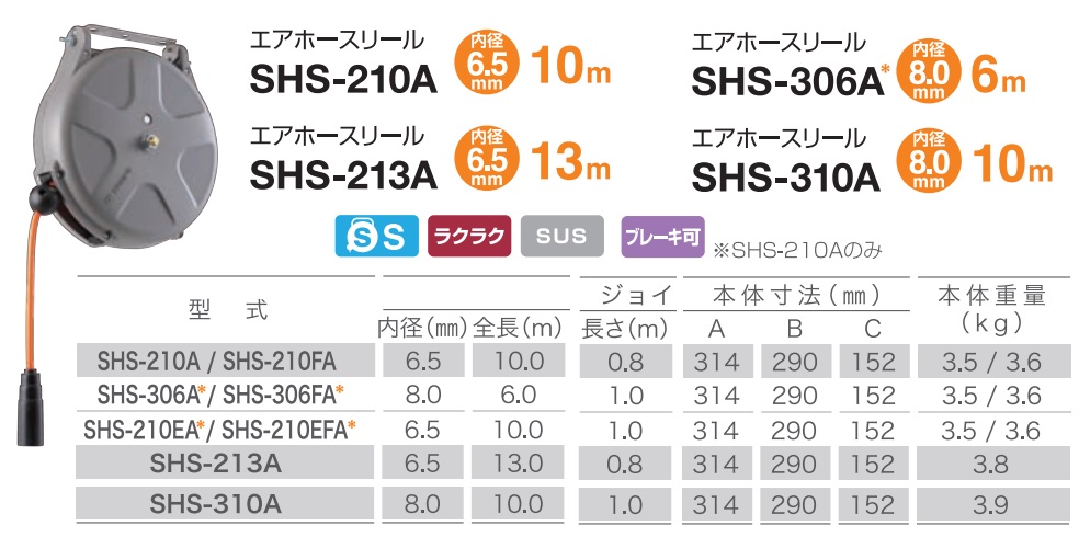 Thông số kích thước, trọng lượng cuộn dây hơi tự rút SHS-310A: