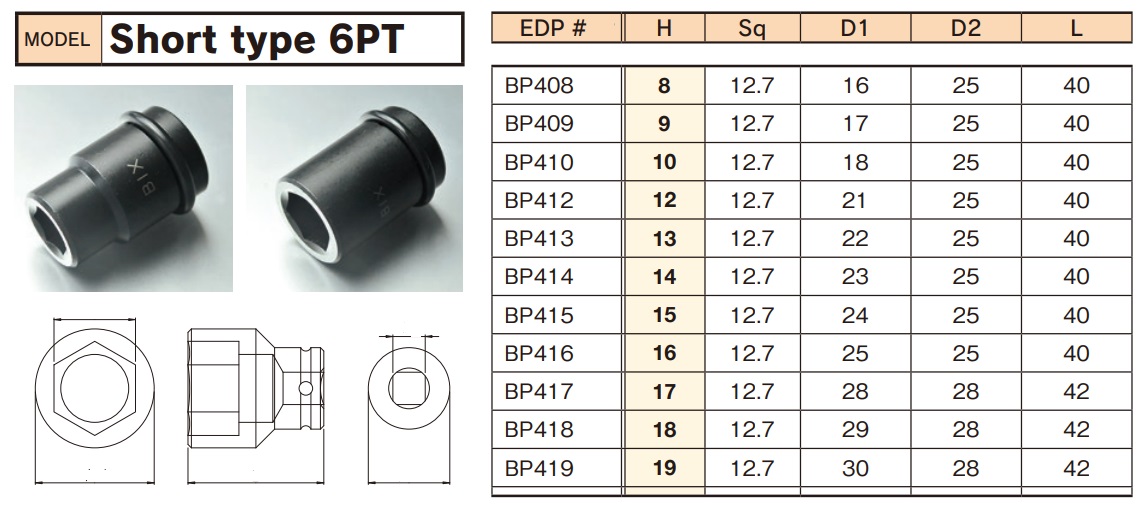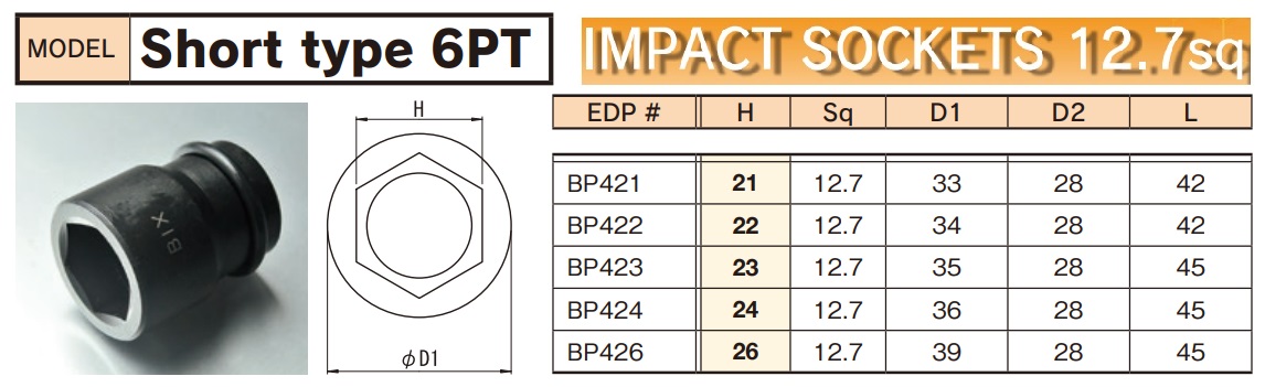 Thông số, hình ảnh đầu khẩu vặn ốc BiX dòng BP4 loại 1/2 inch, chiều dài tiêu chuẩn: