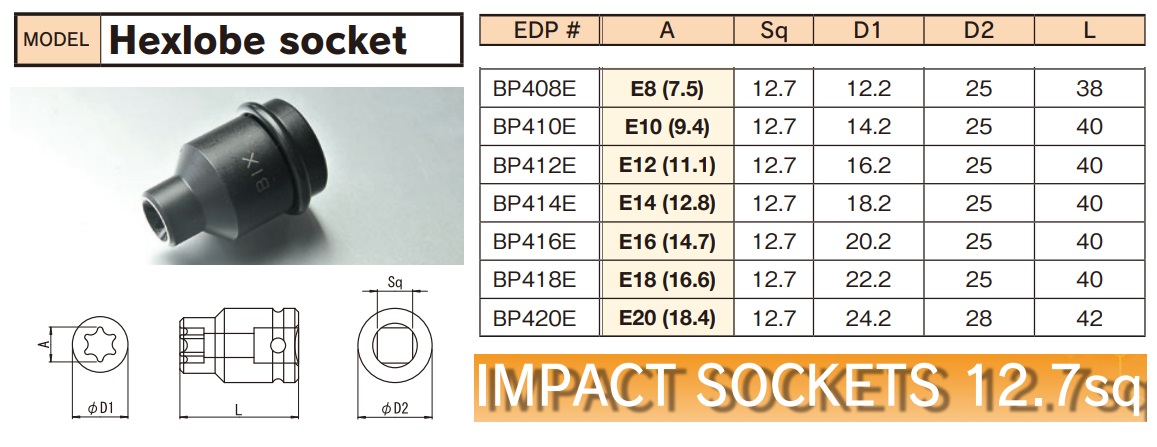 Dòng sản phẩm Hexlobe socket - Phần nối với súng cỡ 1/2 inch (12.7sq) |