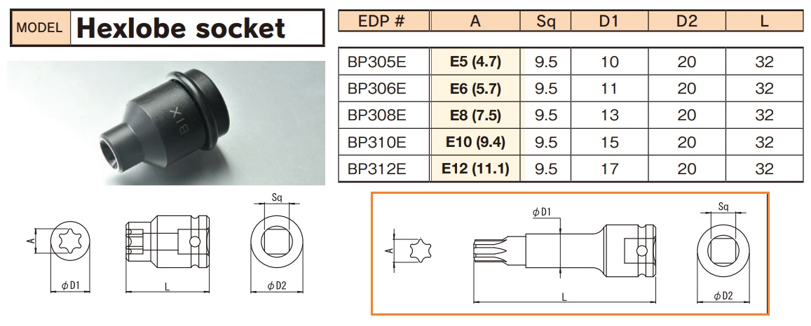Dòng sản phẩm Hexlobe socket - Phần nối với súng cỡ 3/8 inch (9.5sq) |