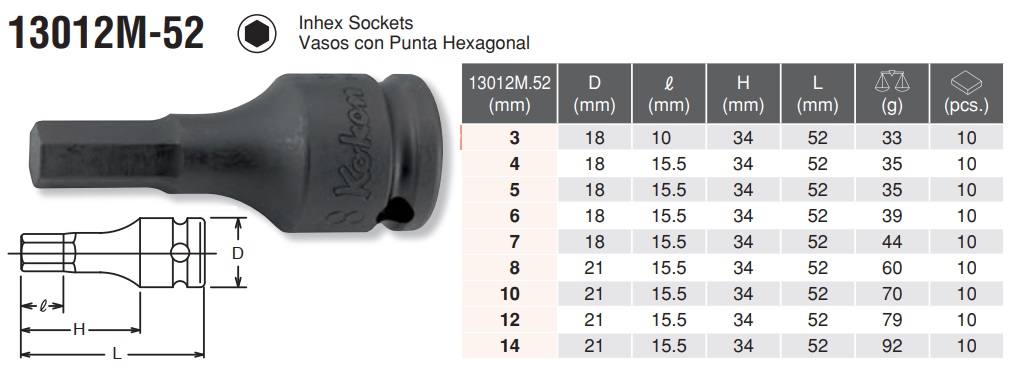 Thông số, sản phẩm đầu tuýp Koken 3/8 inch đầu lục giác, dòng 13012M: