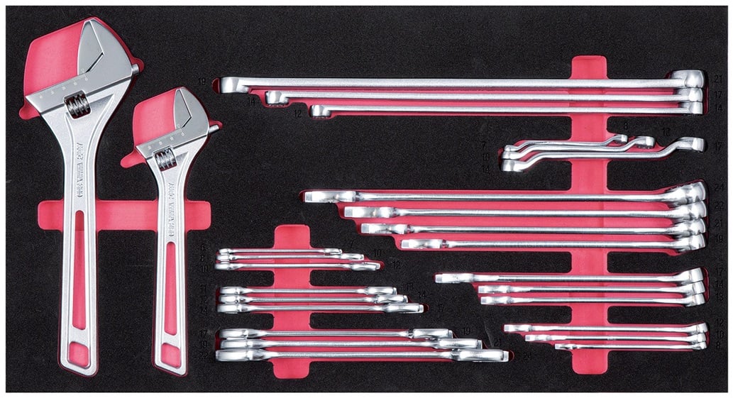 Khay 2 với các cỡ cỡ cờ lê 2 đầu mở, cờ lê tròng, và tròng 2 đầu thẳng |