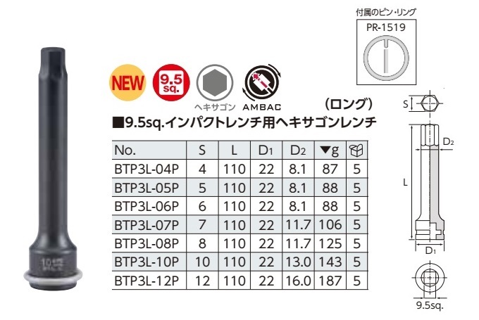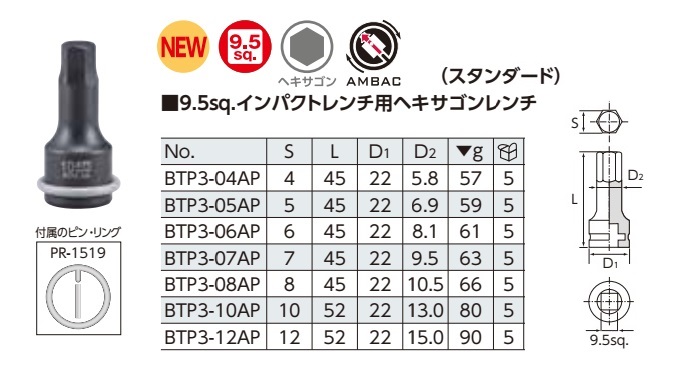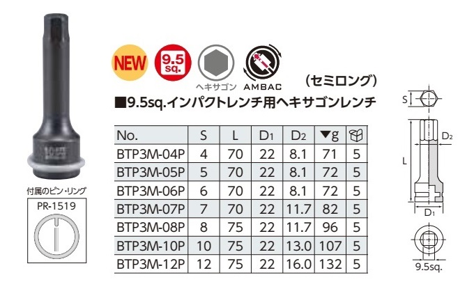 Đầu lục giác chìm với các lựa chọn từ 4-12mm, mã tương ứng BTP3-04AP đến BTP3-12AP