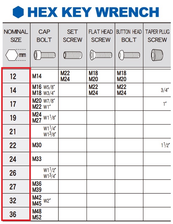 Với các cỡ lục giác cỡ lớn hơn các cỡ thông thường với các cỡ lục giác lớn hơn 10mm, và với các cỡ thông số lớn hơn với các bu lông chìm và các loại vít lục giác chìm. Tham khảo thêm bảng lựa chọn bên dưới.