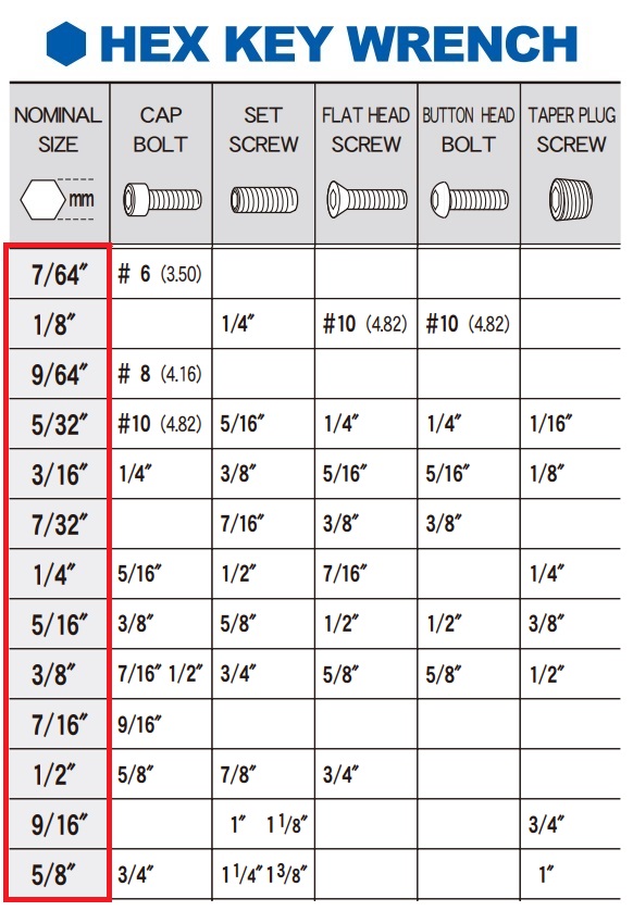 Tương tự việc lựa chọn các cỡ lục giác hệ mét, cân nhắc lựa chọn với các cỡ hệ inch |