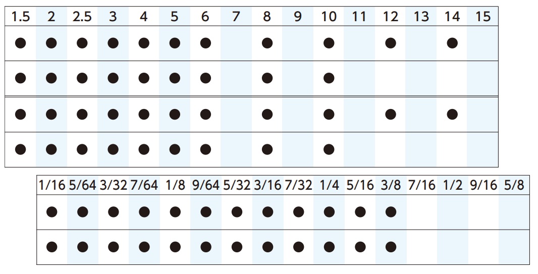 Bộ lục giác chữ L của KTC thông thường được thiết lập với 9 chi tiết từ 1.5mm đến 10mm dùng cho hệ mét. Đối với hệ inch bộ lục giác KTC thường có các cỡ từ 1/16 đến 3/8.