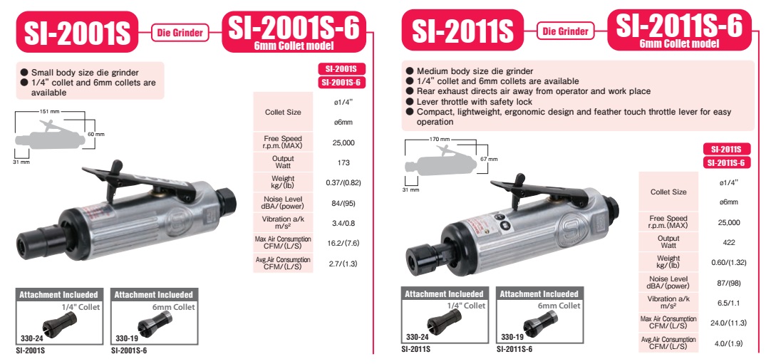 Máy mài khuôn Shinano Mã số: SI-2011S (-6) Với đầu cắm cỡ: 1/4 inch tương đương cỡ 6mm Tay cầm gọn, dễ thao tác Cò bóp có khóa an toàn |