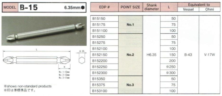 Mũi bits 4 cạnh của BiX Nhật, dòng sản phẩm: B-15 với 2 đầu mũi như nhau. với lựa chọn PH1 - PH3 |