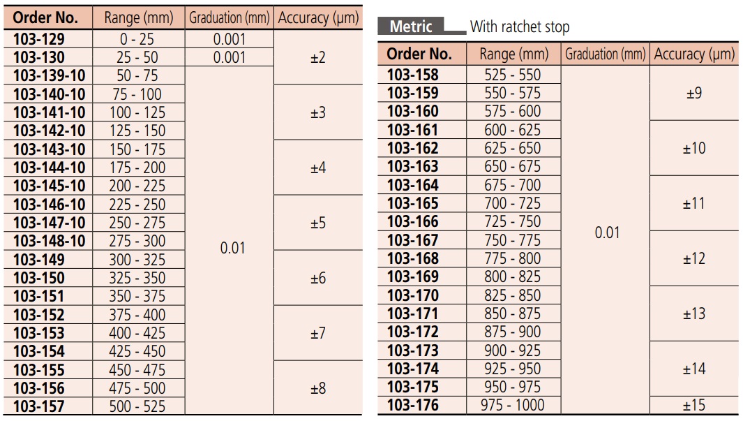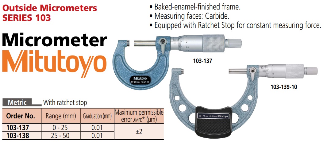 Với dải đo 0-25mm và 25-50mm (0.01): mã số lần lượt là 103-137, 103-138