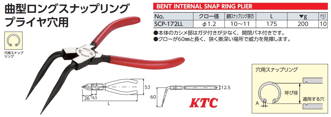 Thông số, hình ảnh kìm mở phanh trong (phe trong) KTC SCP-172LL với mũi 1.2mm: