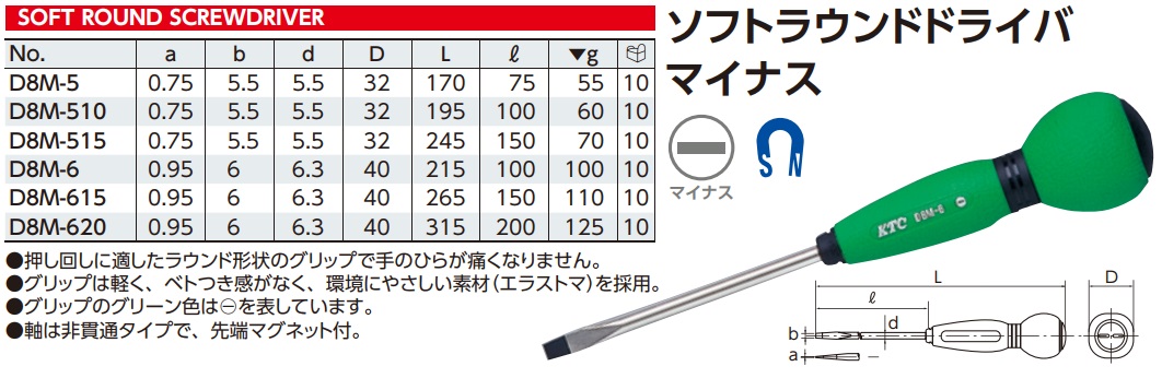 Dòng tô vít, đầu có từ tính, cán nhựa mềm dòng D8M với 6 lựa chọn cho đầu mũi và chiều dài |