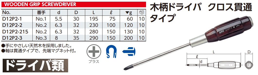 Hình ảnh, thông số của tô vít cán gỗ 4 cạnh KTC dòng sản phẩm D12P2: