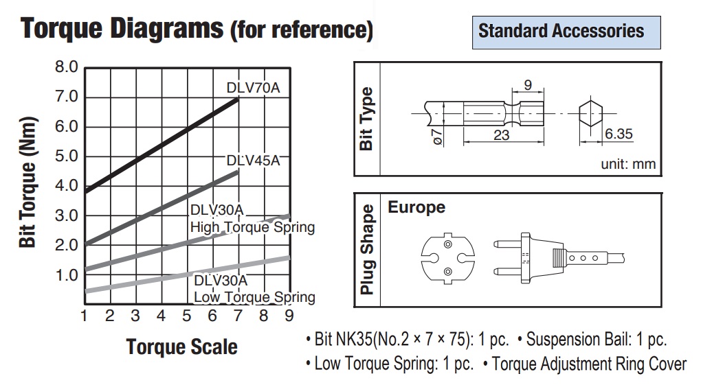 Đồ thị thể hiện dải đo lực tuỳ theo các giá trị đặt lực. Dùng với các đầu vặn vít 6.35mm |