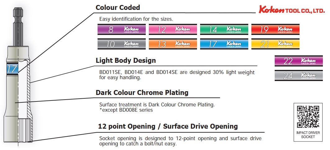 Đầu tuýp 6 cạnh cong giúp bảo vệ cạnh ốc. Koken BD014XE-SF & BD014E-SF |